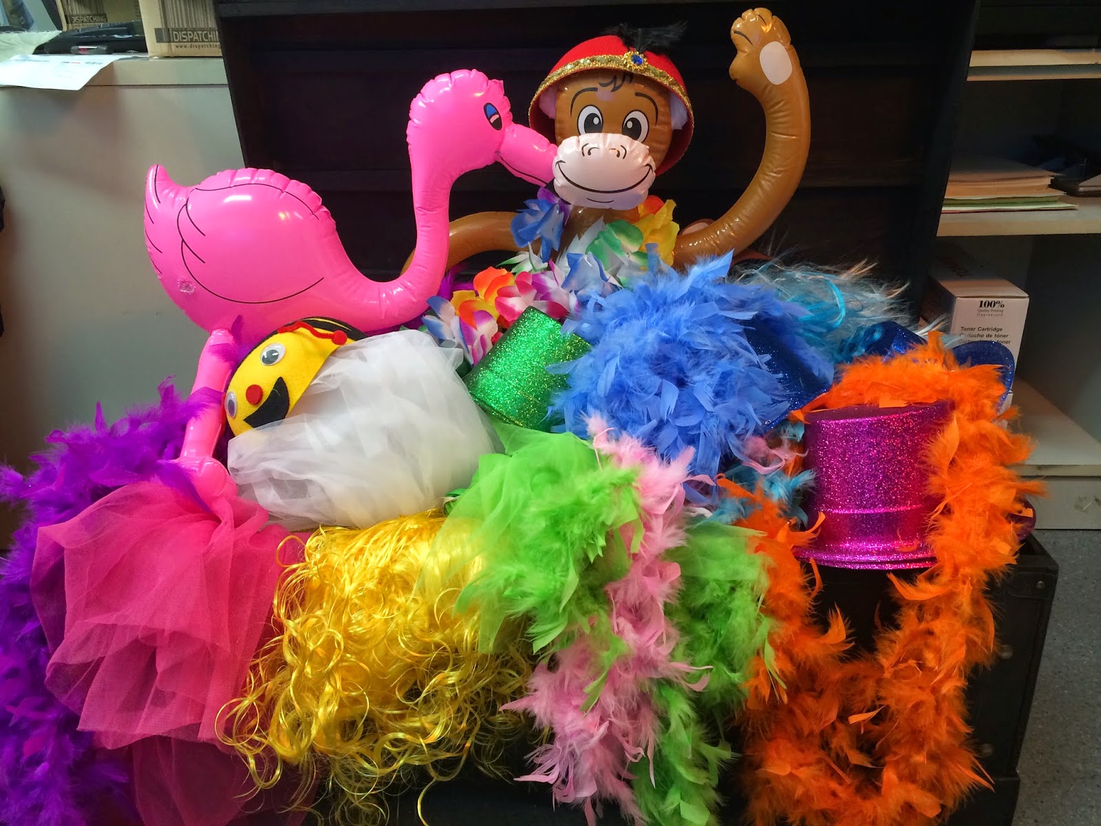 Nos hemos puesto todo lo que hay en ese baúl y hemos estado echando unos bailes por la ofi… aquí os dejamos las pruebas del delito….